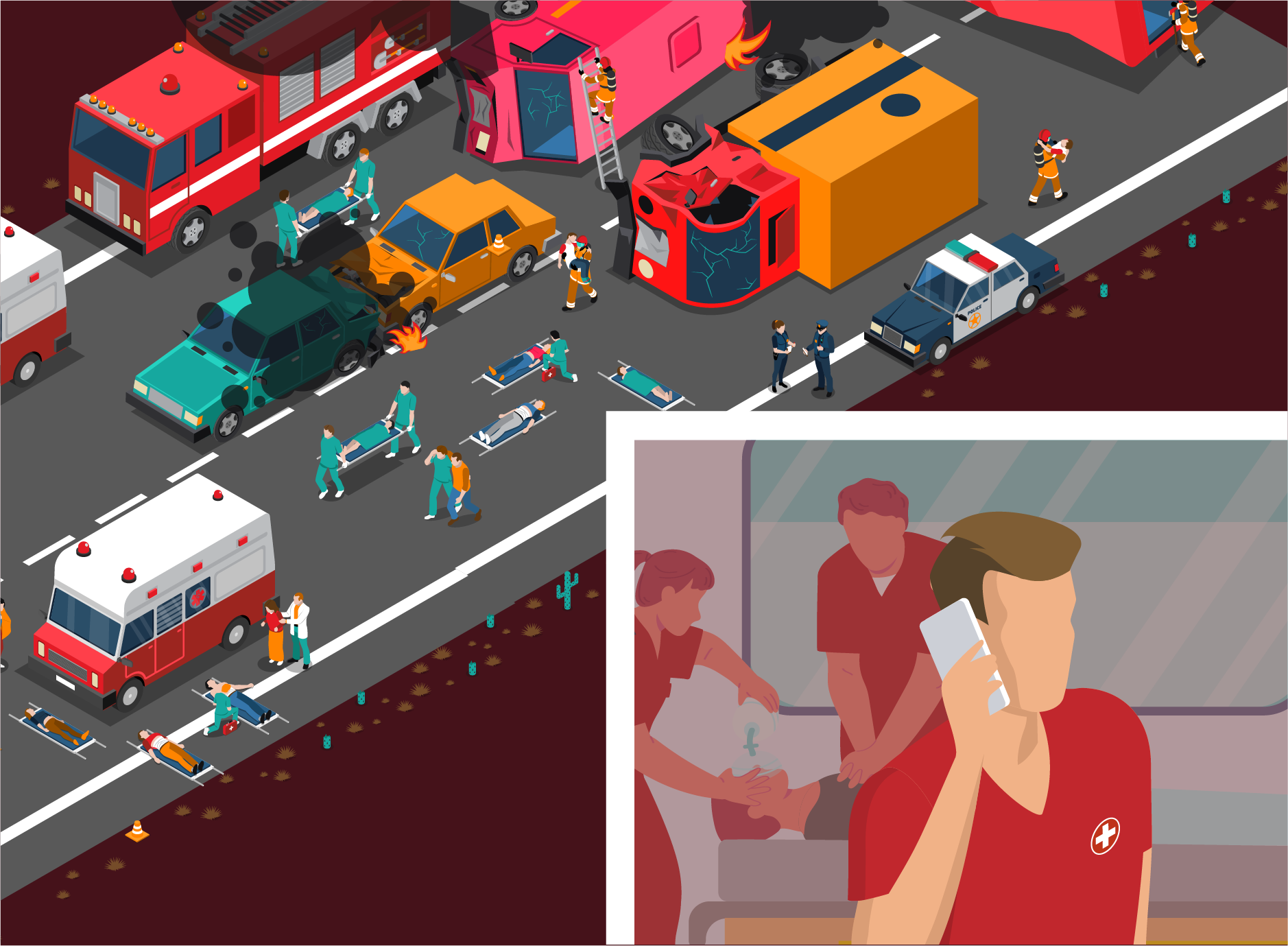 A serious bus accident is reported to the emergency call center. The emergency services are on the scene just a few minutes later: While the fire department and police secure the scene of the accident, the paramedics begin to provide first aid and triage the casualties according to severity of injury.
