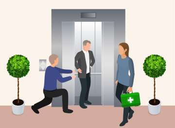 Herr Schmidt befindet sich im Aufzug auf dem Weg in den 4. Stock, als es plötzlich ruckelt und der Lift zum Stillstand kommt. Er hat das gewünschte Stockwerk noch nicht erreicht und auch, als er die verschiedenen Knöpfe der Etagen drückt, passiert nichts. Verunsichert drückt er dann also auf den Knopf mit dem gelben Glöckchen.