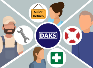 Außerdem werden weitere Verantwortliche telefonisch kontaktiert und über eine kurze Ansage darüber informiert, dass es in Aufzug 3 einen Personeneinschluss gibt. Wenn jemand nicht abhebt, berücksichtigt DAKS Stellvertreterregelungen und eskaliert den Anruf an weitere in Frage kommende Ansprechpersonen.