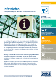 Mit dem Applikationsmodul 'Infotelefon' wird DAKSpro zu einem intelligenten Vielkanal-Ansagegerät. So können durch ad hoc aufgesprochene oder bereits vorbereitete Ansagen viele Anrufer gleichzeitig informiert werden – z. B. für die Umsetzung eines Bürgertelefons.