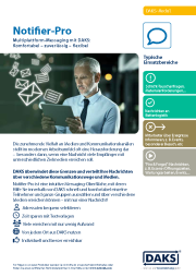 Die zunehmende Vielfalt an Medien und Kommunikationskanälen stellt im modernen Arbeitsumfeld oft eine Herausforderung dar – besonders dann, wenn eine Nachricht viele Empfänger mit unterschiedlichen Zielmedien erreichen soll. DAKS überwindet diese Grenzen und verteilt Ihre Ad hoc-Nachrichten über verschiedene Kommunikationswege und Medien. Die Messaging-Oberfläche Notifier-Pro macht Messaging effizienter: Erreichen Sie beliebig viele Teilnehmer und Gruppen einfach und zielgerichtet mit nur einer Nachricht!
