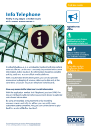 With the function module 'Info Telephone', DAKS becomes an intelligent multi-channel announcement device. This means that many callers can be informed simultaneously using ad-hoc or pre-recorded announcements – e.g. for the implementation of a citizens' hotline.